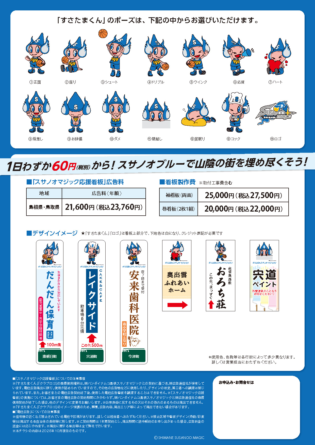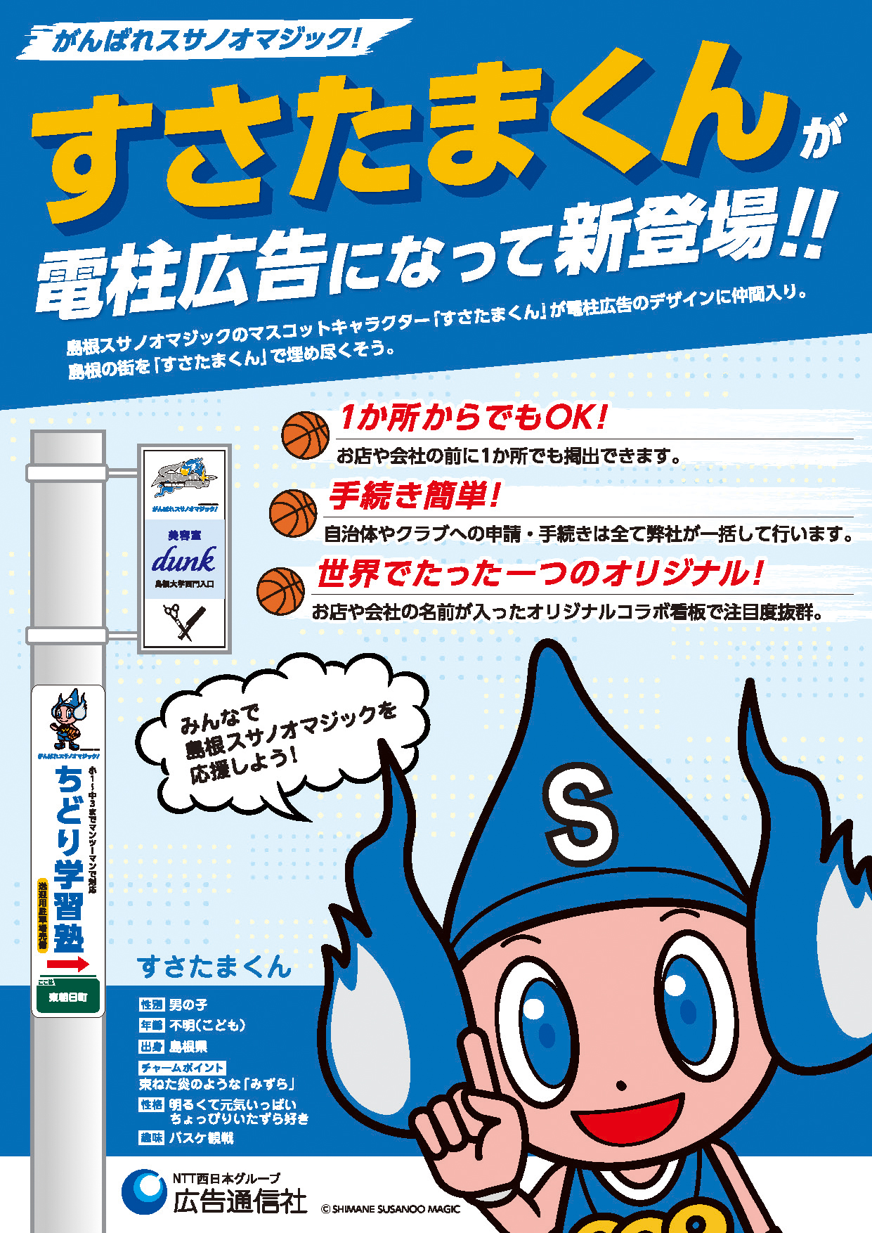 広告通信社は、島根スサノオマジックのマスコットキャラクター『すさたまくん』をあしらった電柱広告の販売を開始しました。『すさたまくん』のポーズは、シュートやドリブル、コック帽子姿など13種類とバリエーションも豊富です。『すさたまくん』を利用した電柱広告は、スサノオマジックファンの皆さんのみならず、地域の皆さんの注目度アップも期待できます。島根の街を『すさたまくん』の応援広告で埋め尽くし、『島根スサノオマジック』を応援しませんか。